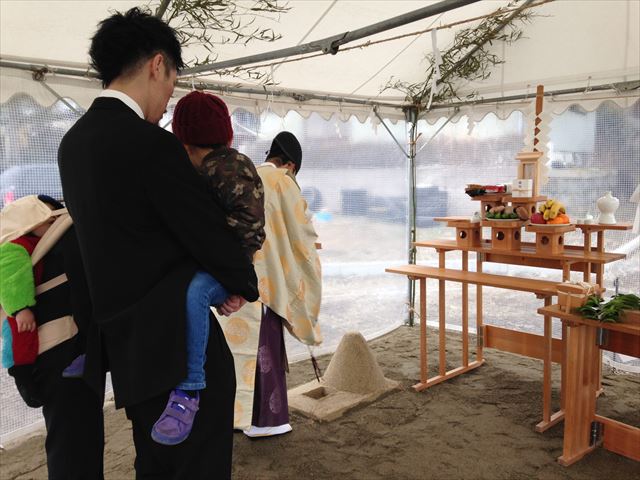 寒いなか、そして雨男(お施主様)・雨女(私)のせいか小雨も降るなか、滞りなく式をあげて頂きました。