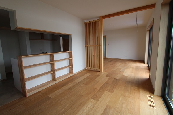 リビングに入ると、ナラの天然木フローリングがあたたかい、