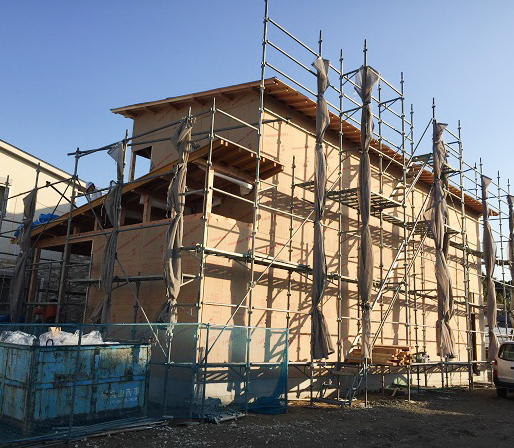 構造体が組み上がった後は、屋根と壁を下地で閉じていきます。