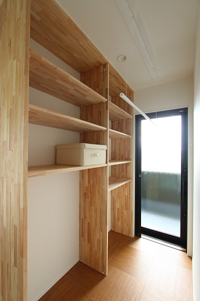 洗面室にタオルや、下着、アイロン台も収納できる棚と、