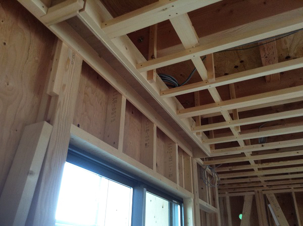 まだ下地の様子ですが、斜めに上がっている屋根の角度に合わせて天井が上がり、かなり広々と感じられます。