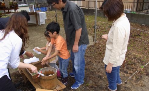 地鎮祭では これから始まる工事の安全を祈願し、宮司様に土地をお祓いして頂き